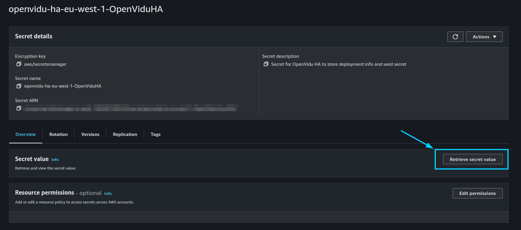 The Output Key ServicesAndCredentials of the previous section points to an AWS Secret Manager secret that contains all URLs and credentials to access the services deployed. You can access the secret by clicking on the link in the Output Value column.
