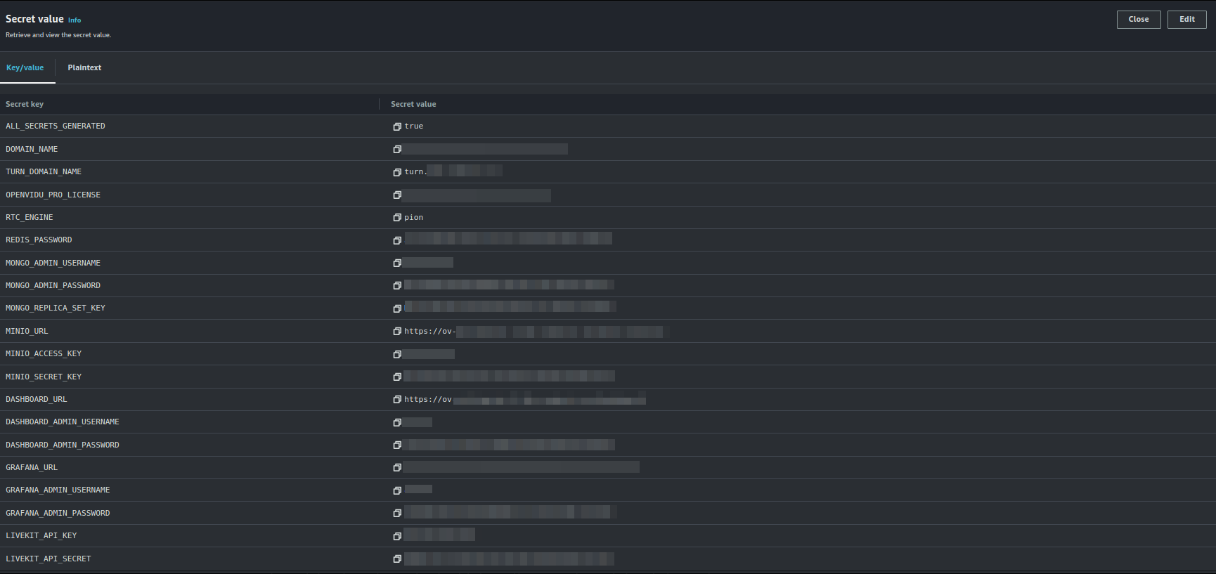 To use your OpenVidu deployment, check the values of the JSON secret. All access credentials of all services are defined in this object. The most relevant ones are: