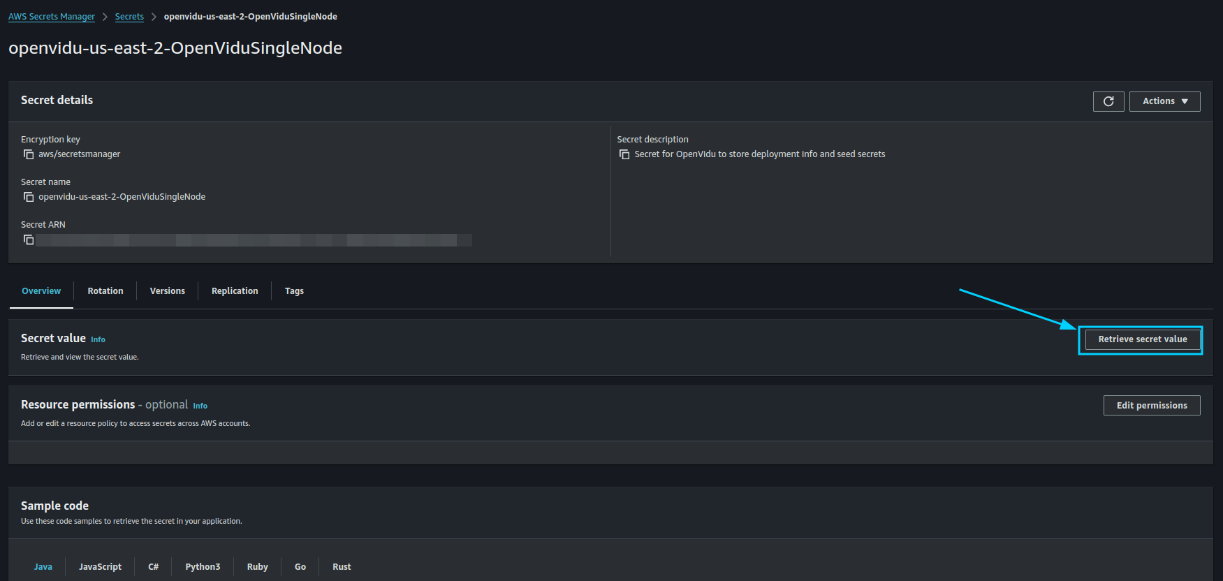To use your OpenVidu deployment, check the values of the JSON secret. All access credentials of all services are defined in this object. The most relevant ones are: