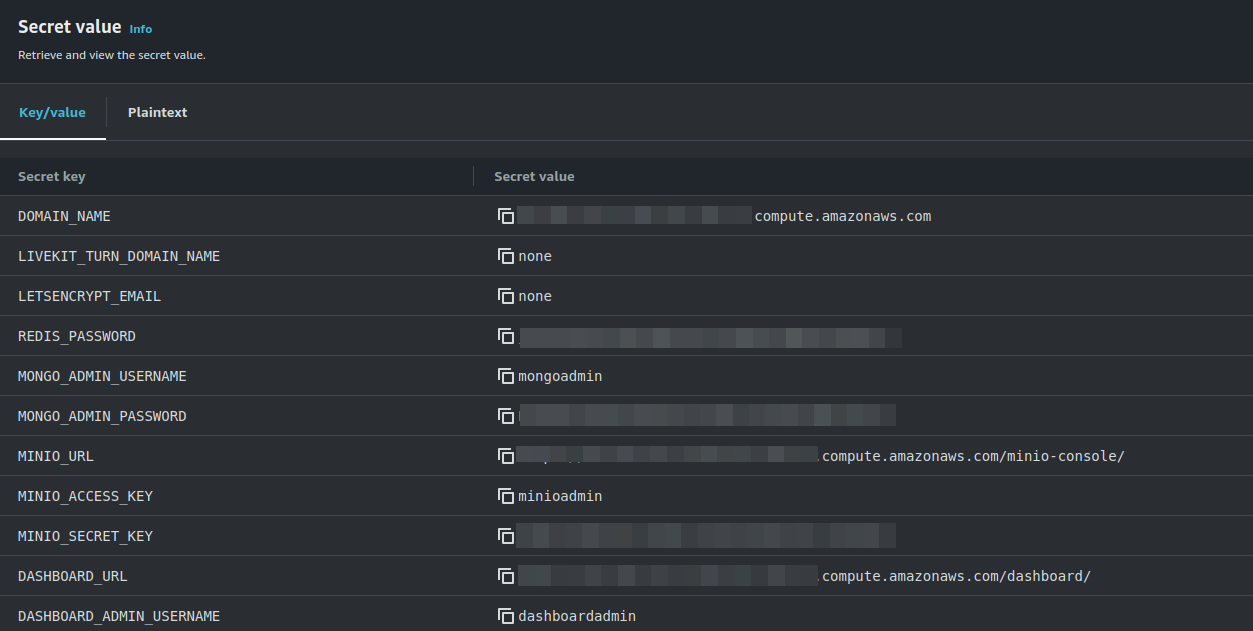 The Output Key ServicesAndCredentials of the previous section points to an AWS Secret Manager secret that contains all URLs and credentials to access the services deployed. You can access the secret by clicking on the link in the Output Value column.