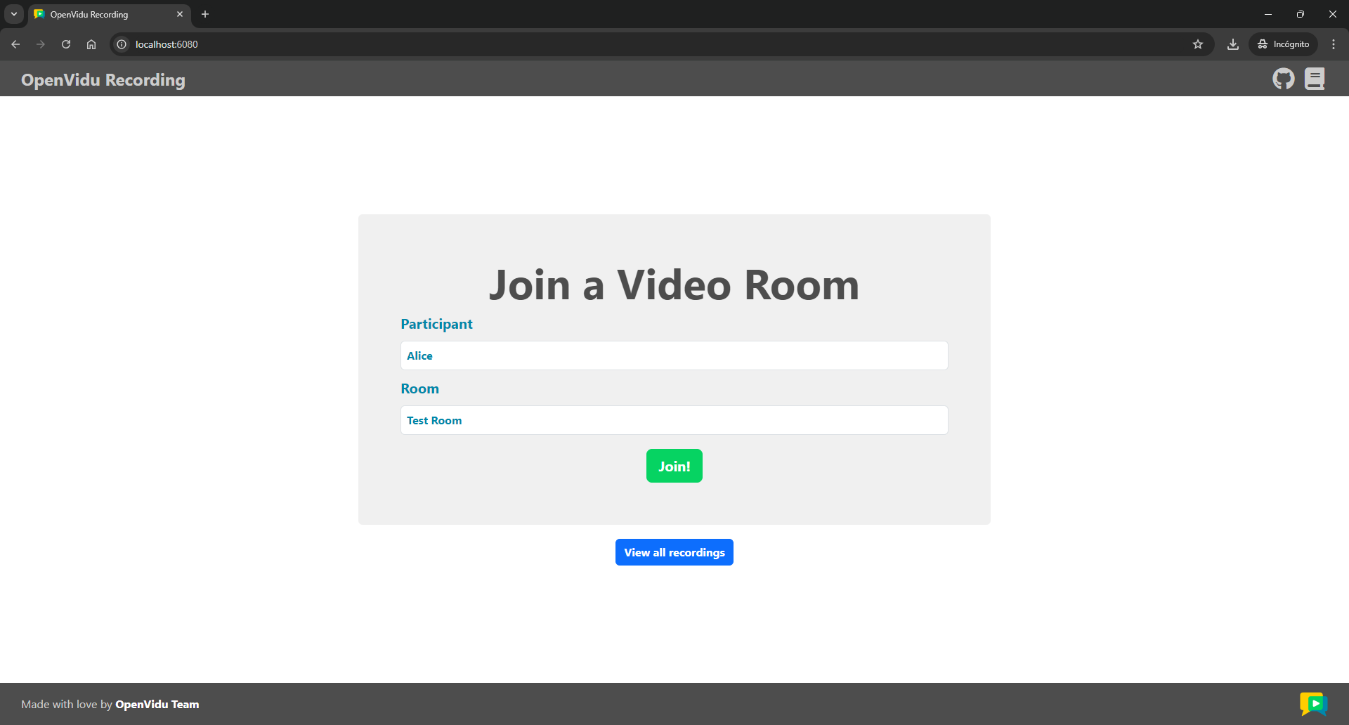 Limitation: Playing recordings with the S3 strategy from other devices in your local network is not possible due to MinIO not being exposed. To play recordings from other devices, you need to change the environment variable RECORDING_PLAYBACK_STRATEGY to PROXY.