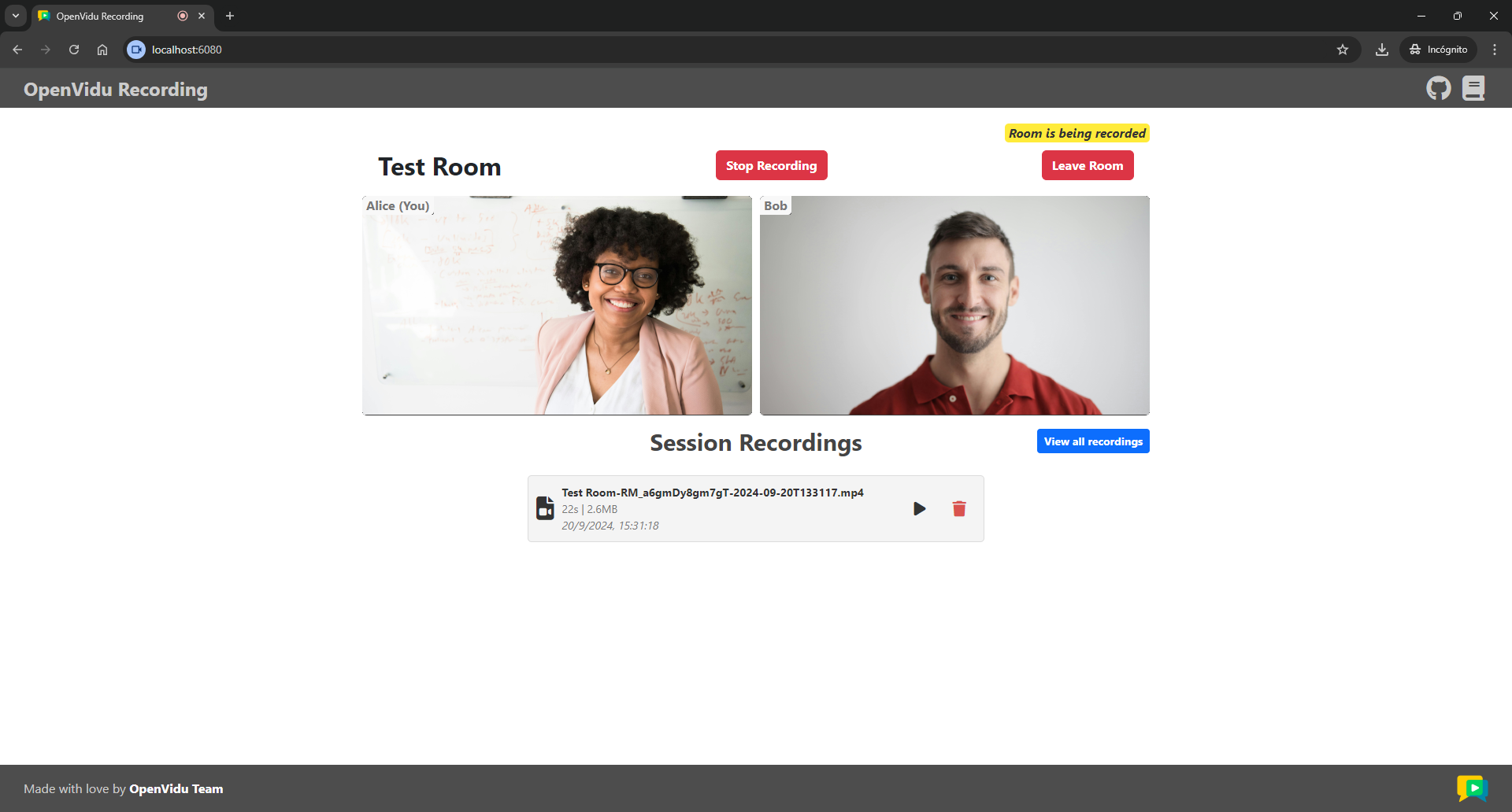 - When running OpenVidu locally or On-Premises, recordings are stored in a local S3 Minio bucket.