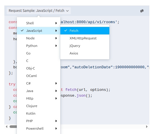 The reference documentation provides code snippets for each REST API method. You can choose from countless languages and frameworks and copy-paste directly to your code.