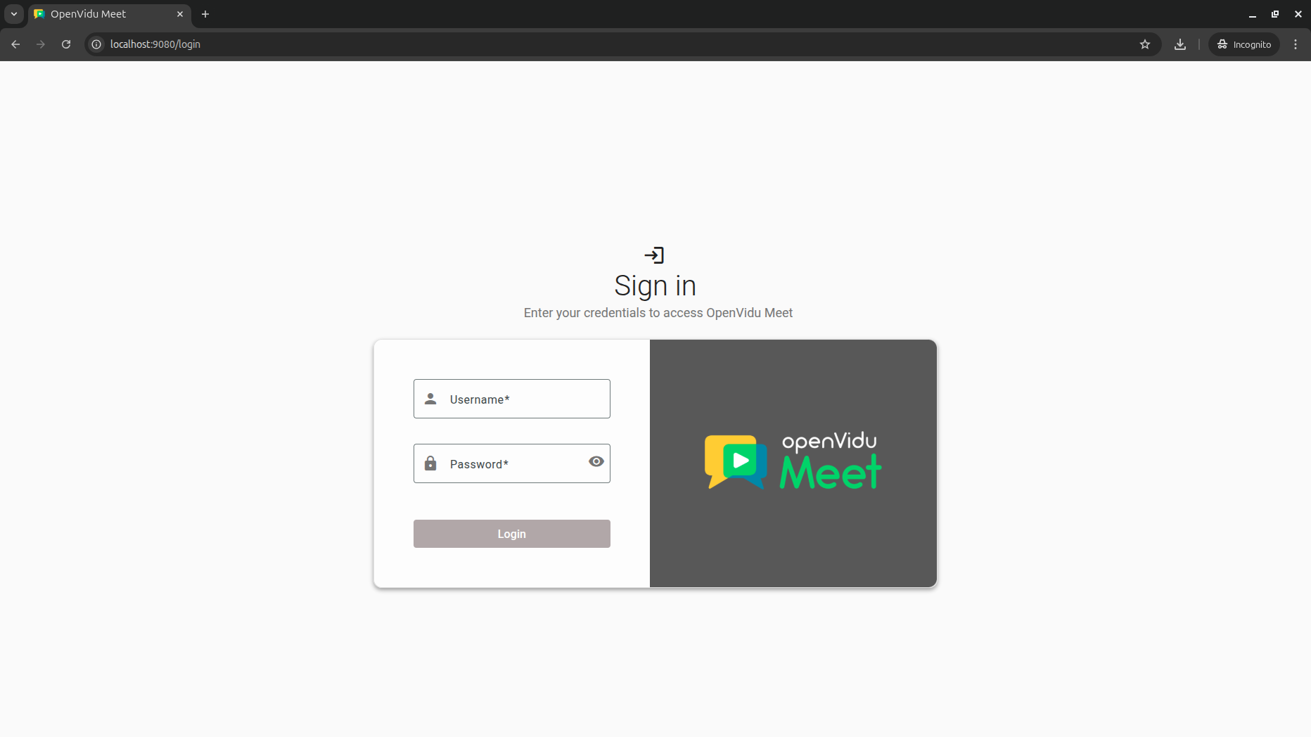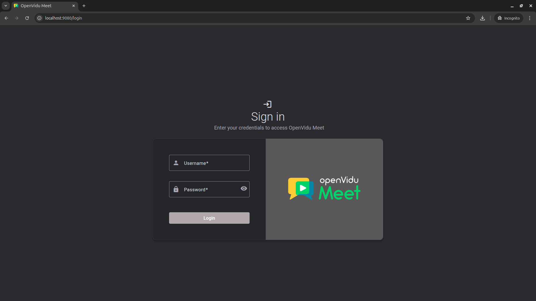 OpenVidu Meet is by default protected with an administrator username and password. These credentials will be required when accessing OpenVidu Meet console: